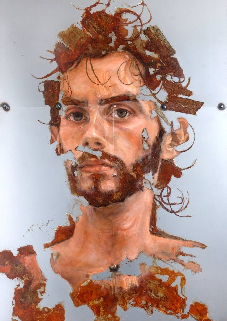 How a face can be the mirror of many, not always decipherable, shades of human emotional state. The painting is on 3 welded steel plates, where it's like the oxidations degrade the matter, while the figure wants to stay alive...