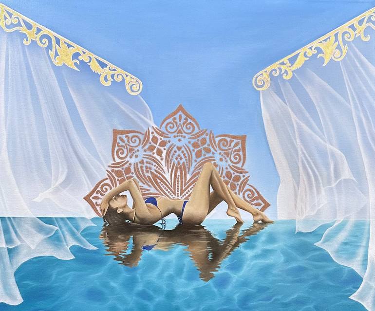 Empowerment - Meditation Mandala, an exquisite piece of wall art that will captivate your senses and inspire self-reflection. Meditate with it and connect with your empowered self. This original oil painting depicts a strong, confident woman in a bikini, laying on the pool side, creating her own ref...