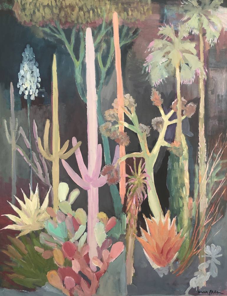 Canvas mounted on heavy wood backing; Inspired by my drives through the Arizona desert with forests of Saguaro cactus and Joshua Tree Park in California. Bright contrasting colors and a textured finish. My desert paintings are from imagination and memory - from hours of google and instagram browsing...
