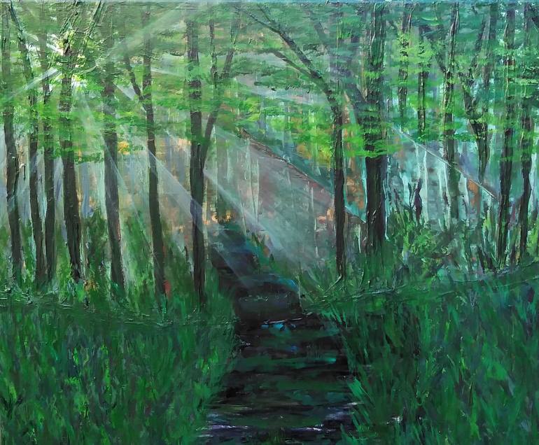 Enchanted Forest is an acrylic painting that depicts a lush, magical forest, surrounded by towering trees, warm soft sunrays to enhance the thought of a new day and a vibrant array of flora and fauna. The painting captures the energy of nature and invites the viewer to connect with its healing power...