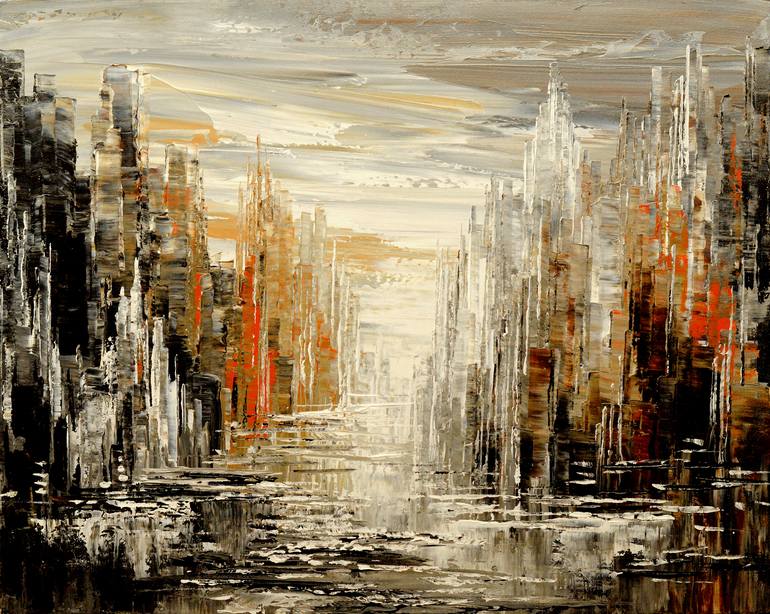 This is an original palette knife urban landscape painting. Sides of the canvas are painted dark gray and can hung with or without frame. Protective coat of satin varnish applied. Wire attached. The painting is signed on the front and the back and delivered directly from my studio.