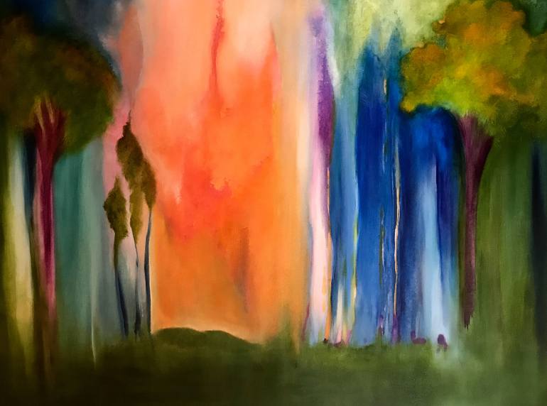 This painting is inspired by the feeling I have when I am among the huge, beautiful redwood trees in the forests of Northern California. There is an experience of awe from the expansive height of the trees pleasantly combined with the cozy shade of the paths where moss and ferns and other elven plan...