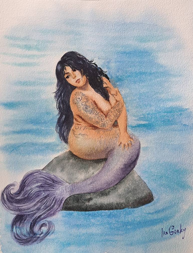 This watercolor mermaid Art piece measuring 12" x 16" / 30 x 40 cm is an original, hand-painted piece, and is signed by the artist Ira Gorky.