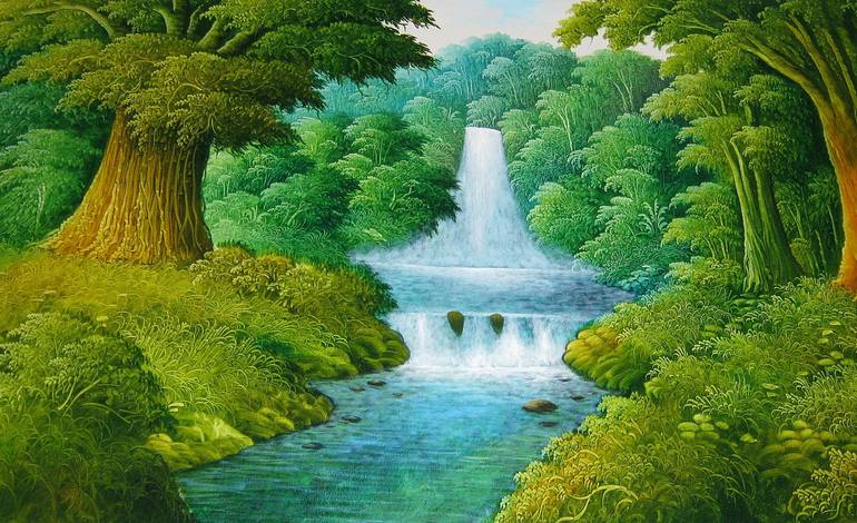 Discover the allure of “Whispering Cascade,” a breathtaking oil painting that encapsulates the enchanting beauty of a secluded waterfall. This beautiful waterfall painting, measuring 135x85cm, is a tribute to nature’s elegance, featuring a vibrant display of cascading waters surrounded by lush fore...