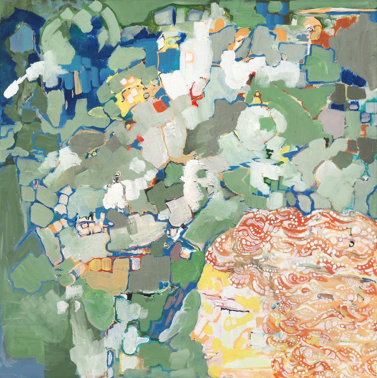 I don't typically depict people or figures in my paintings, and when the person appeared to me throughout the process of creating this work, I was delighted with her disposition. This artwork represents a joyous interaction between the figure and her surroundings; it is up to the viewer to determin...