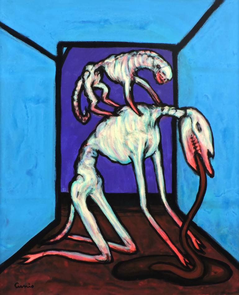Acrylic paint and varnish on canvas. Metal hanger, wire hanger and original exhibition announcement card attached on back. Wood strip frame (lath), painted black, nailed to canvas edge is original to the piece. This was exhibited in Three of No Kind - Arno.Cunis.Fitschen, CBGB’s 313 Gallery in 1999...