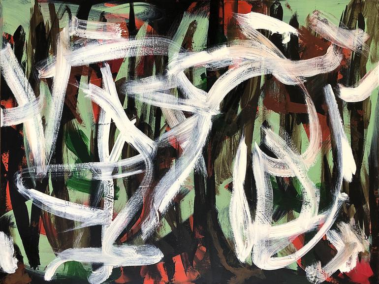 Gestural abstraction consisting of bold, intuitive strokes. This work is signed, dated and titled on the back. It is shipped ready to be hung. This bold, expressive piece will add drama in any location.