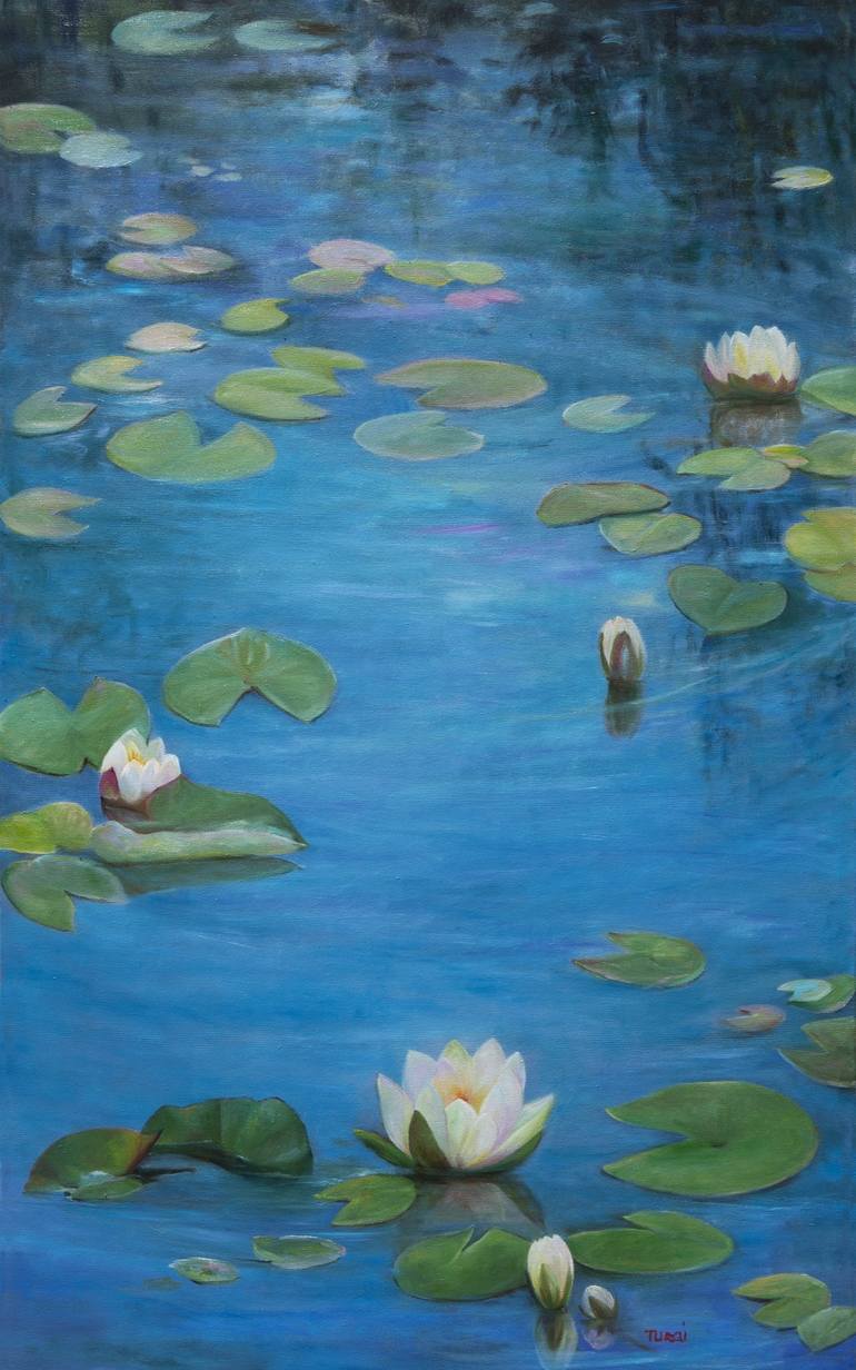 I have always loved and admired Monet's water lilies, this painting is a nod to that. It was based on a series of photos I took from a pond near my home.