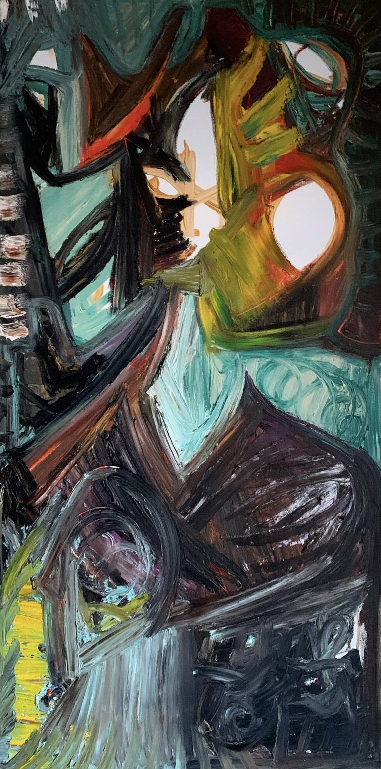 Companion to the Duke in the two painting Energion Series, ZZB captures the elegance of the Duchess. A bold mixture of jewel tones set amidst the misty blacks and grays evokes the mystery of her wandering the moors at midnight in a cloak of velvety black. This piece is stunning in its imaginative u...