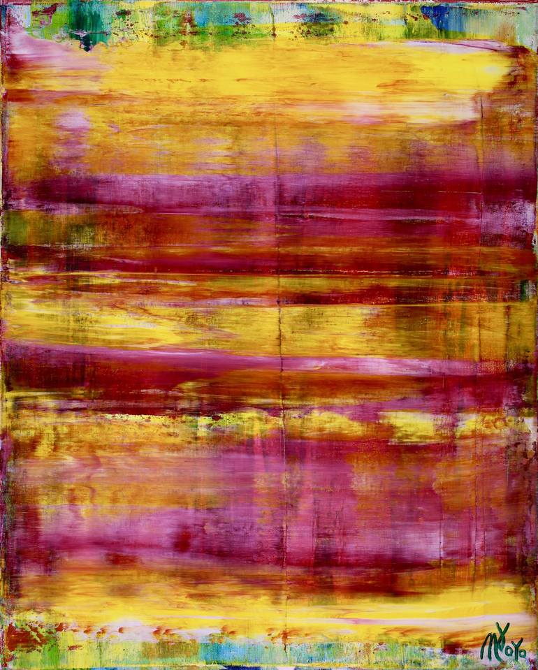 Vibrant abstract acrylic colorfield, rich colors. Pink, bright yellow some green and blue. Signed, ready to hang. For this work I used a large palette knife and hand mixed acrylic paint and mediums. The work is completely created spontaneously and is allowed to develop organically with no preconcei...