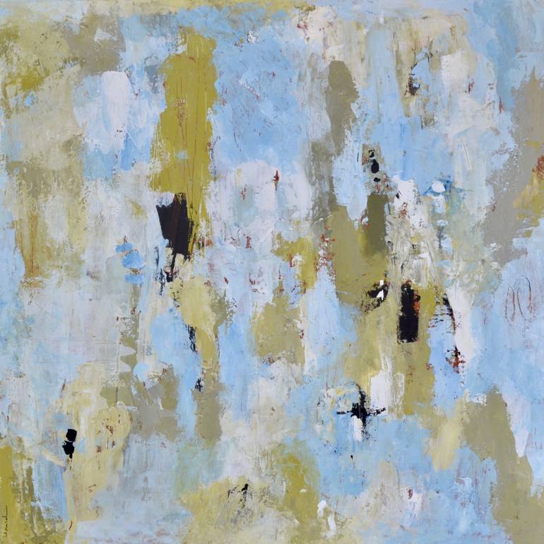 The canvas bursts with an explosion of energy, capturing the intensity of the creative process. This abstract painting is a vibrant display of life and movement, reflecting the artist's passion and spontaneity. Dominating the composition is a soothing and ethereal light blue. The serene hue fills t...
