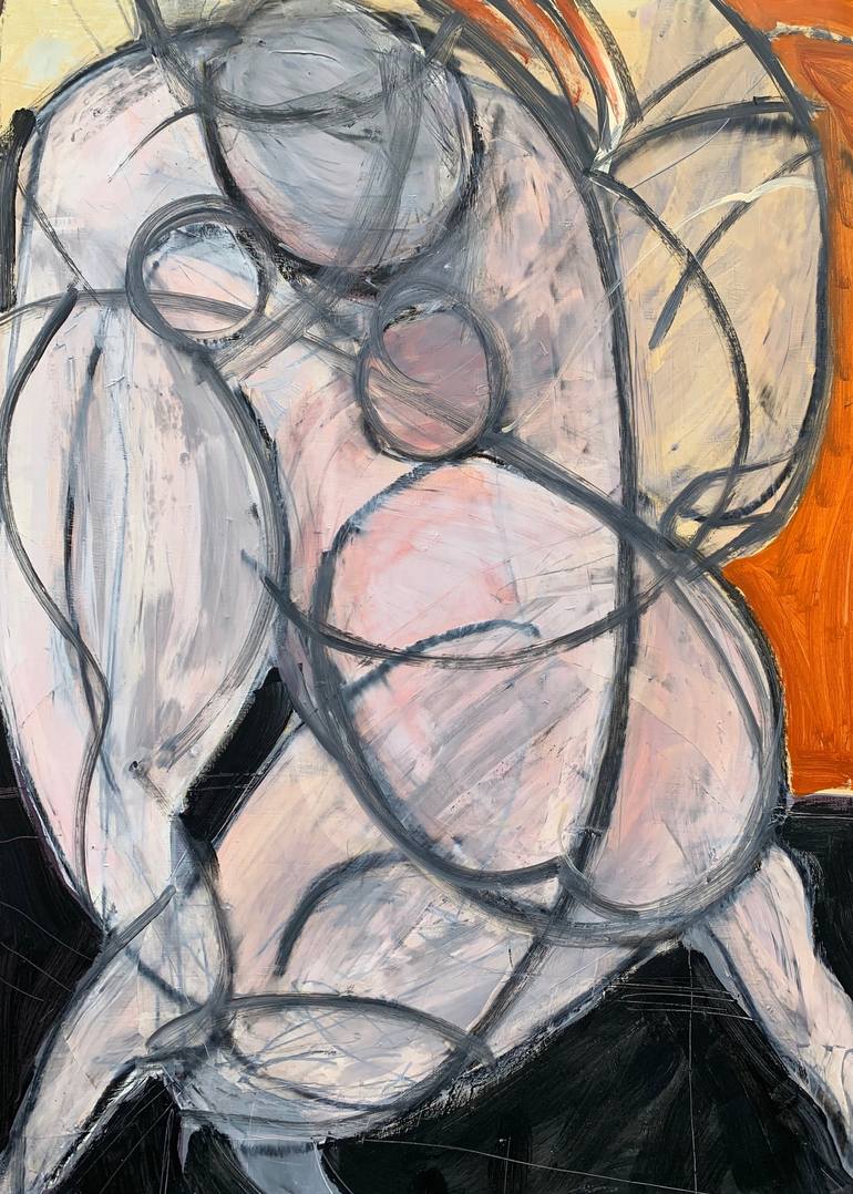 Oil, acrylic and charcoal on board hung with a French Cleat. Enfold is part of a series exploring the body, its space, movement through dance, life both physical and emotional.