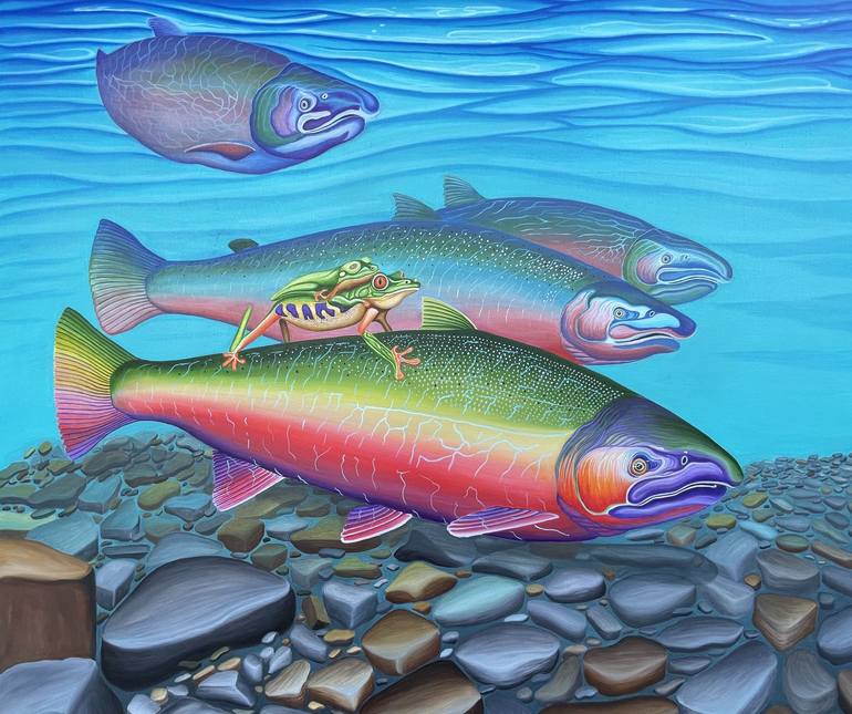 Spawning salmon on the final journey. Carrying a new mother (treefrog)and assisting her on the beginning of her new borns journey.