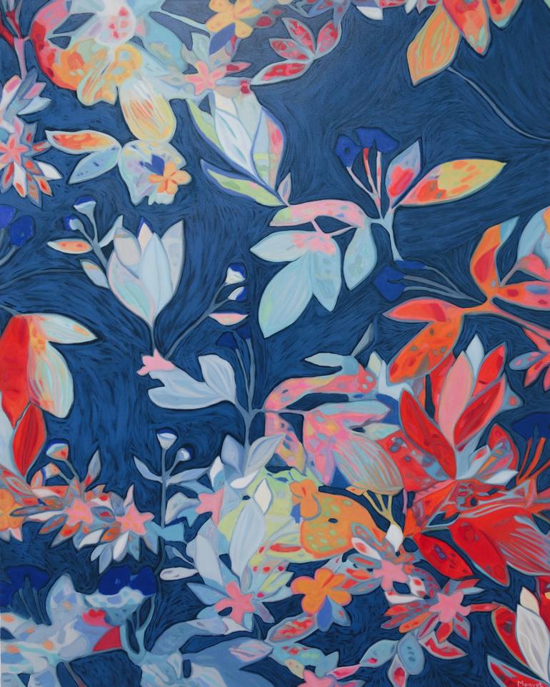 Nathalie Maquet is a contemporary French artist currently living and working in Aix-en-Provence. She completed a MSci in Mathematics at Imperial College London in 2001. After 9 years working in the financial services industry in the City of London, she decided to go to art school to pursue her passion for painting. She completed a BA in Fine Art at City & Guilds of London Art School in 2012. Nathalie’s paintings are about a spontaneous experience of nature and an always changing and flowing reality. Viewers are invited into the imaginary, where they experience a fluid and vibrant world of light and colour. She has been exploring nature from different points of view: up close to discover its depths, and further away to explore a wider expanse of the landscape. An intuitive process guides Nathalie, where the painting organically evolves. This is a process of taking natural forms such as flowers or a landscape with a strong physical structure, and then de-constructing it. Shapes and details are radically simplified to find nature’s essential form. She is also interested in exploring rhythm and how organic and natural patterns are used to create a feeling of movement and a sense of balance and harmony.