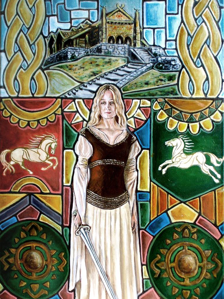 Original fanart painting, 50 x 70cm (approx 20 x 28") oil & damar varnish on canvas. Canvas stretched on a wooden frame, and the sides are completely painted. (No frame or stretching needed.) The work inspired by Lord of the Ring movie, and was made like a medieval stained-glass window. Thank you...