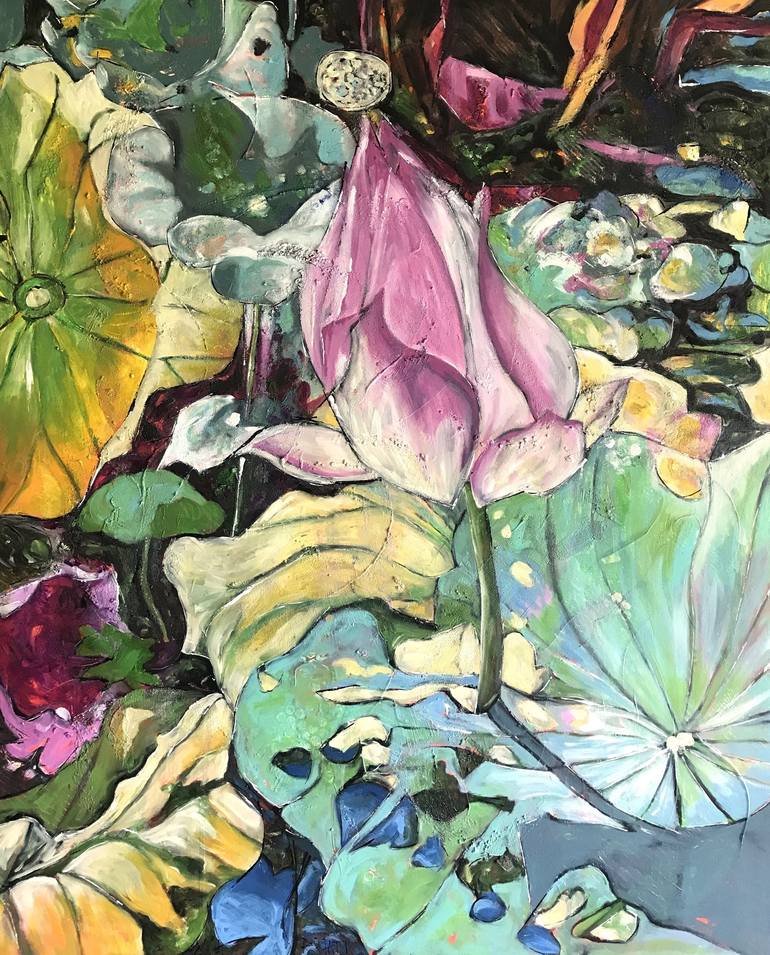 in my life I have seen lotus flowers in different countries, and it changes all the times; This one is the Vietnamese lotus flower. I love them all. So zen, so lovely and just great. I mixed some sand in certain colors, it gaves an architectural aspect, the canvas is alive, like the flowers;
