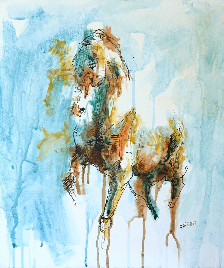 Born in 1975 in the Paris suburbs, Bénédicte Gelé lives and works in France, while exhibiting regularly on the international scene. She paints horses the way one explores an emotion: with attention, nuance, and depth. A passionate self-taught artist, her artistic path first developed alongside a career as an art director and graphic designer — a background that still resonates in the precision of her line and the balance of her compositions. Her connection with horses began in her teenage years, long after they had already taken over the margins of her school notebooks. Her first mare, bought at the age of 18, became a guide. Through observing her, Bénédicte learned to read emotion in postures, gestures, and subtle shifts — to observe without projecting, to feel without noise. In her painting, the horse becomes a raw land, sensitive and shifting, to be explored more than depicted. A living territory, mirroring inner states, made of gestures, silences, and traces. Formats and techniques vary depending on what needs to be expressed or brought to light. Semi-abstract painting, textures, fragmented bodies: everything speaks of instinct and inner resonance. Now fully dedicated to her artistic practice, Bénédicte Gelé explores the horse as a language in itself — both intimate and universal. The horse becomes a mirror, a messenger, a being as much as a language. Artist Statement For Bénédicte Gelé, painting horses has never been about representation. What drives her is what the animal brings to light: raw emotion, inhabited silence, inner resonance. The horse becomes a territory — a living, sensitive matter to explore rather than depict. A raw land where each brushstroke, each trace, reveals a fragment of humanity. Her semi-abstract work emerges from deep listening — to the body, to the present moment, to intuition. She works in mixed media, constantly exploring, layering, scraping, revealing. The line — rooted in her background as a graphic designer — remains central: at times structure, at times fracture, it guides the gaze through compositions where strength and fragility coexist. Each piece is a silent dialogue between the artist and the animal — and, in its own way, between the artwork and the viewer. Because if the horse acts here as a mirror, it is to help us connect more deeply with ourselves.