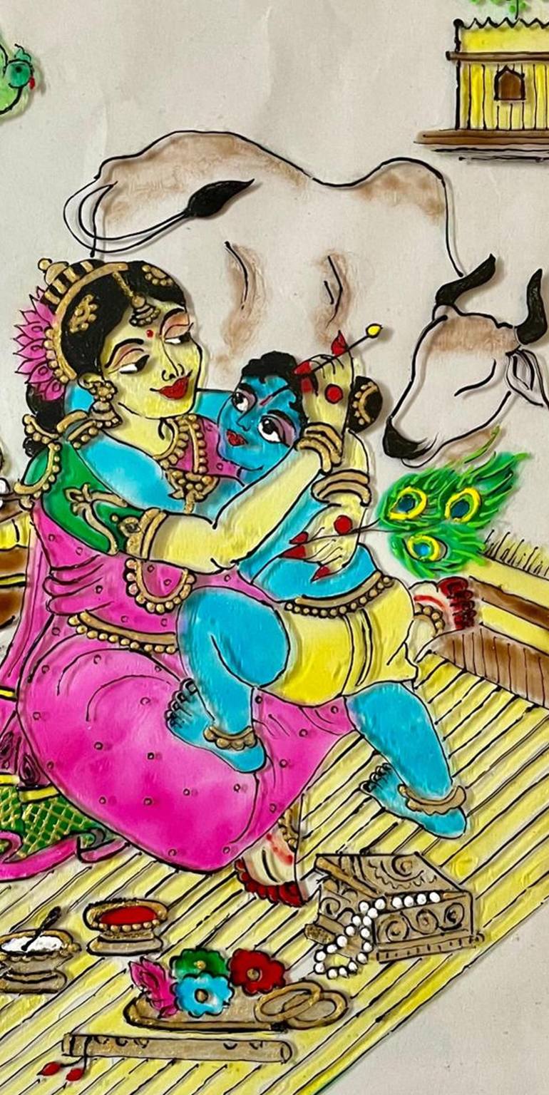 Step into a world where time stands still with the essence of divine love. Behold a masterpiece that captures the very heart of devotion, where Krishna, the embodiment of innocence and purity, graces this painting as a mesmerizing child. In the tender embrace of his beloved mother, Yashoda, Krishna ...