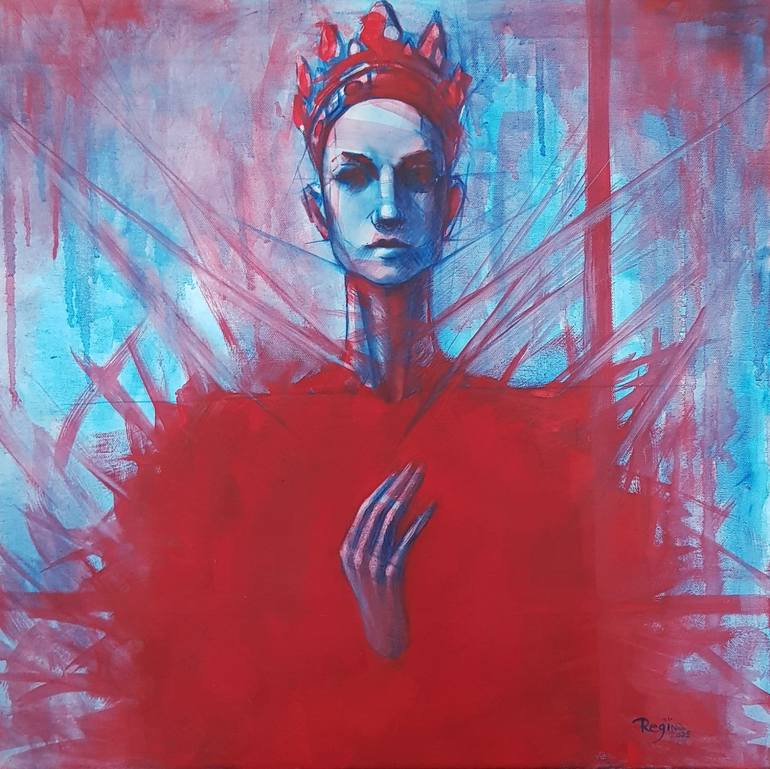 In the vibrant realm of contemporary art, "Et nomen meum est Regina" captures the essence of identity and emotion in a striking way. This oil on canvas, measuring 60x60 cm, invites viewers to explore a narrative filled with contrast and depth. The artwork's bold reds and cool blues create an immedi...