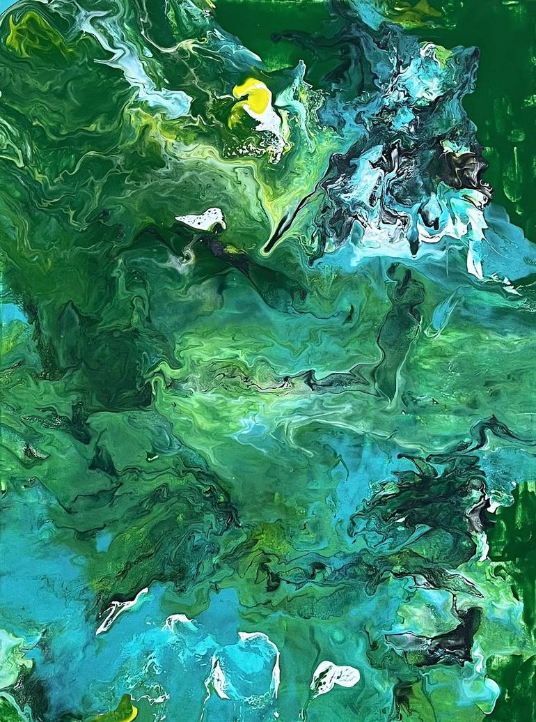 Eternal Tapestry: Nature's Resilient Symphony (left) - Unveiling the vibrant tapestry of nature's harmony, depicted through a palette of greenish hues intertwined with dark, mountainous veins. - Illuminating the inherent power of the natural world to regenerate and sustain itself year after year. -...