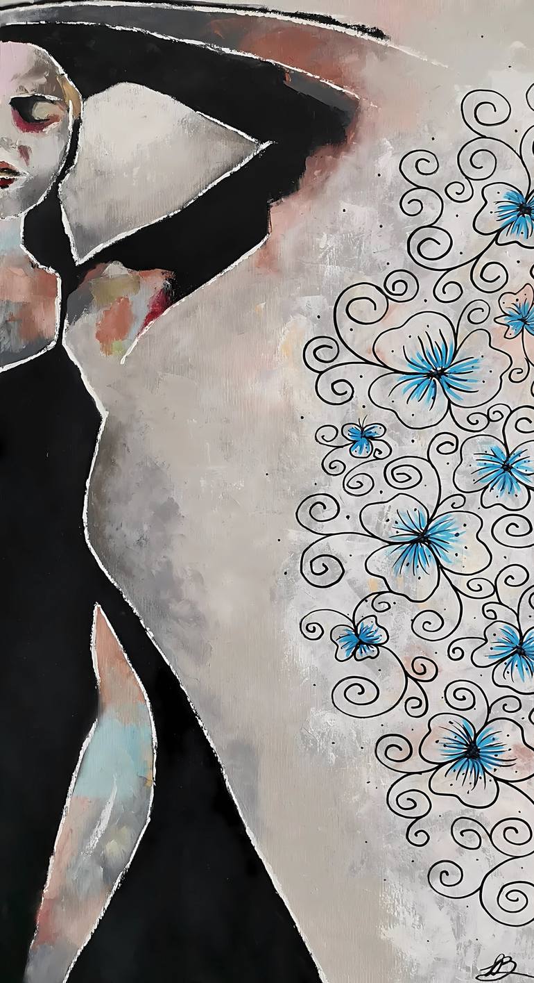 Ethereal Dance of Light and Shadow - Abstract Figure with Blue Floral Accents. 50x90, oil on canvas. Immerse yourself in a world where light dances with shadow in this enchanting abstract artwork. “Ethereal Dance of Light and Shadow” features a stylized figure with an outstretched arm gracefully rai...