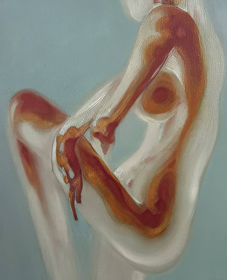 The painting presents a striking figure, elegantly posed in a contemplative moment. The soft curves of the subject's body seem to blend seamlessly into the background, creating a sense of fluidity and intimacy. This ethereal quality is intensified by the smooth brushwork, which whispers rather than ...