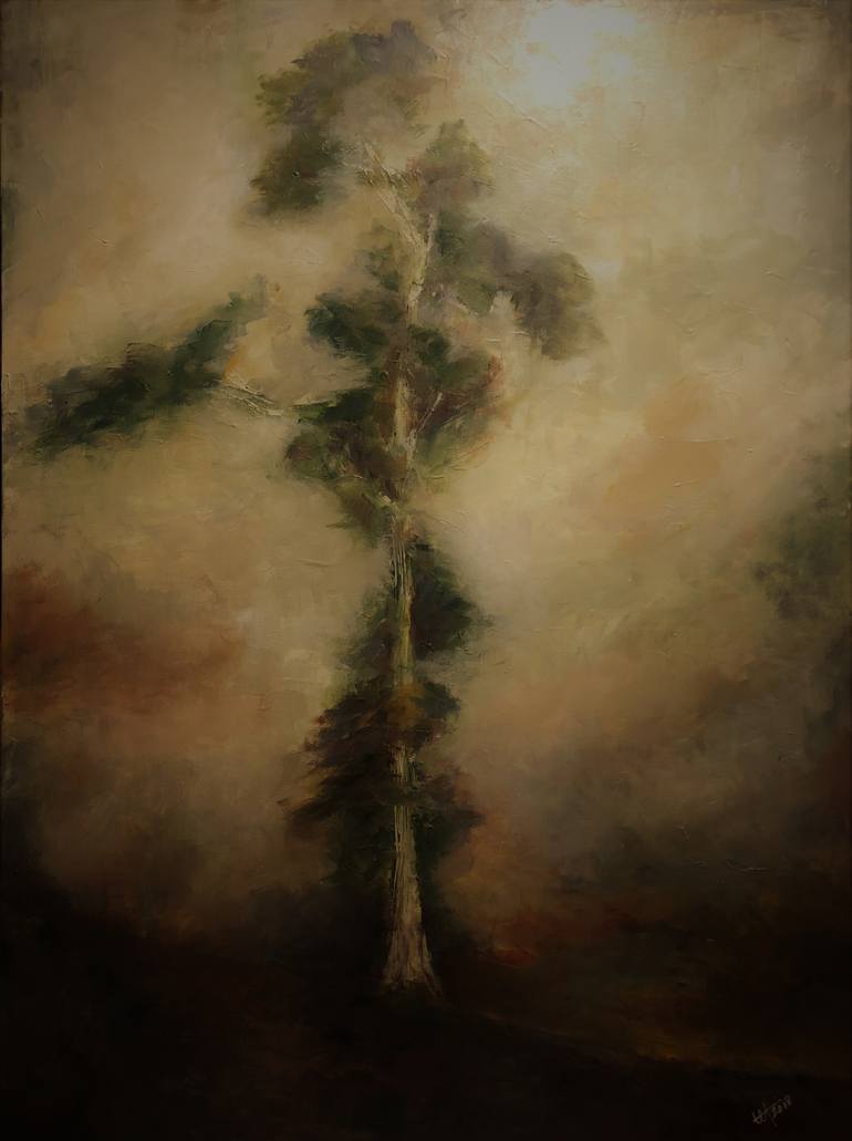 Large expressionistic painting of the archetypical California Eucalyptus tree.