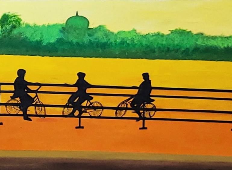 "European Bikers" is a captivating 24x21 inch acrylic on canvas painting. The piece features the silhouettes of three cyclists captured against a vibrant, multi-hued sunset. The scene exudes a sense of tranquility and leisure as the bikers ride across a bridge, framed by lush green foliage and a pic...