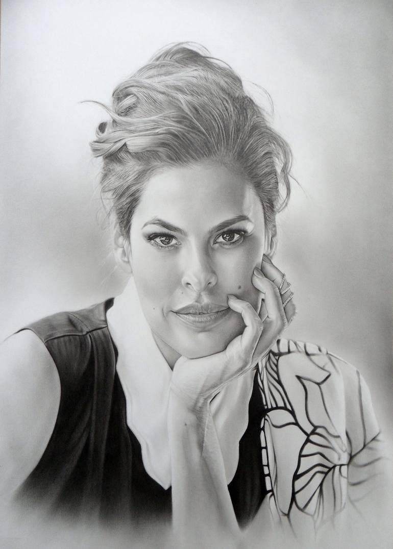 Portrait of Eva Mendes with painted oil paint. Portrait made with dry brush technique. This is a very realistic creation where the goal is to work out the smallest details. That's why it takes a lot of time to paint such a portrait. Hair development requires special attention and patience.