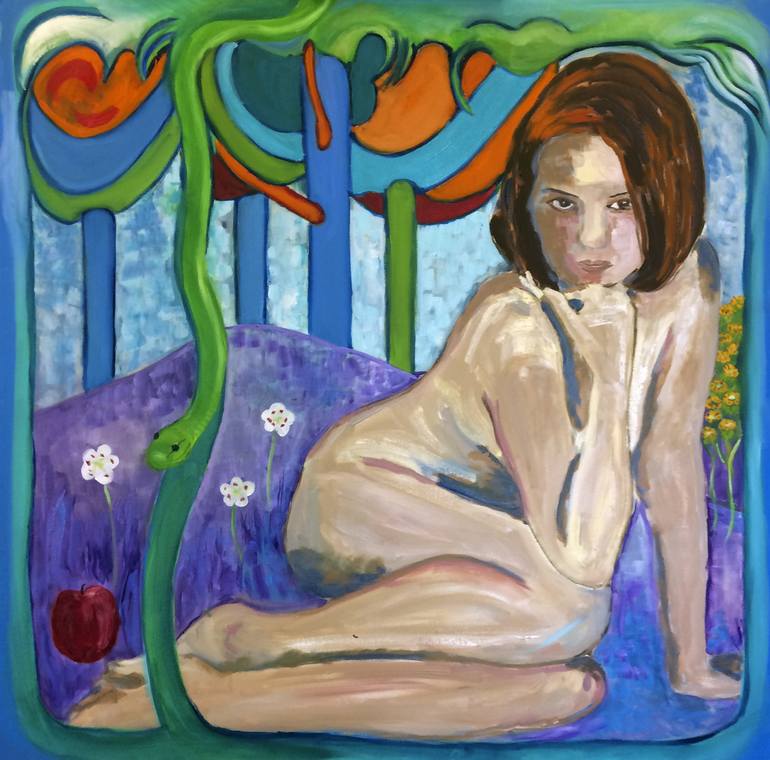 I wanted this painting to have a lots of primary color and to get your attention. I like how the women is naked but she is not timid. She is in your face and not apologetic for it. I named her Eve as a Biblical reference to Adam and Eve. She is a temptress and seductive. The apple and the snake loom...