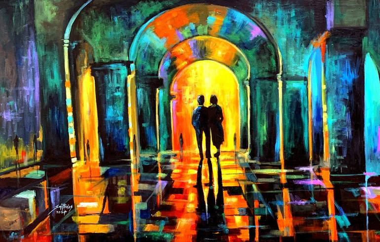 A vibrant, colorful scene depicts two silhouetted figures walking through an arched corridor bathed in warm, glowing light. Bright reflections create a mosaic of hues on the floor, enhancing the sense of depth and atmosphere.