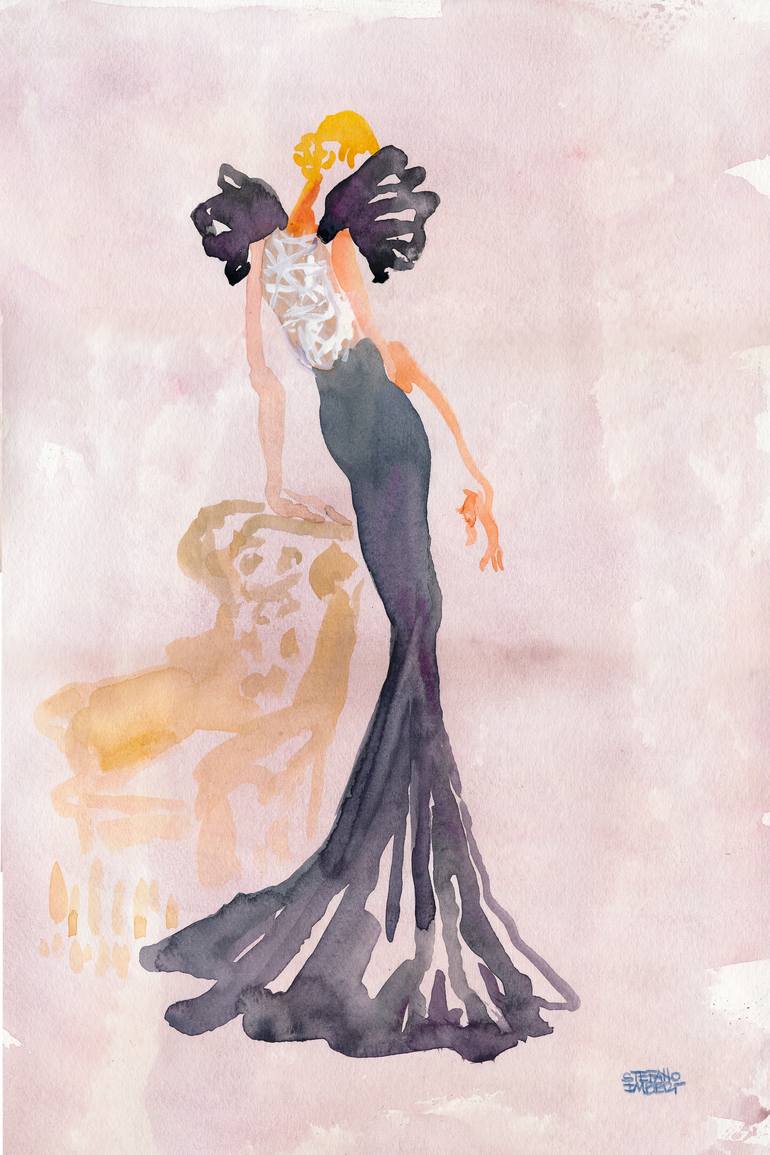 This image is a contemporary spin on classic fashion illustration with a focus on the woman's gown against a highly texturized background. I was inspired by her pensive pose as if she's waiting for something to happen so she can take action.