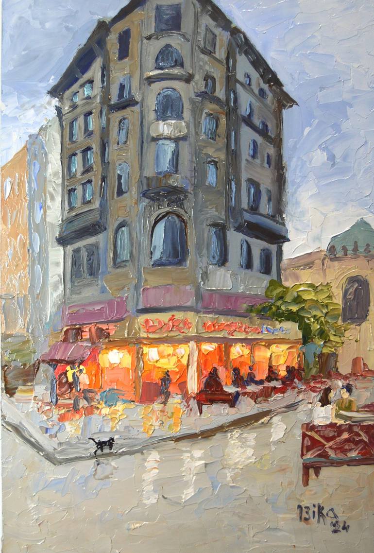 This painting depicts a renowned spot in the heart of Istanbul. In the evening, as lights illuminate cafes and shops, creating a cozy atmosphere. People leisurely relax by the roadside, savoring the beauty of this magnificent city. Along the way, a cat dashes, seemingly embodying the guardian of thi...