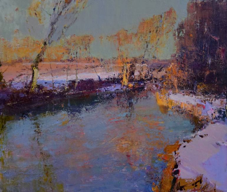 TITLE: "EVENING GOLD" MEDIUM: Oil on Canvas YEAR: 2021 DIMENSIONS: 70 х 80 cm / 27.6 х 31.5 inches WORK: Original Oil Painting, Handmade Artwork, Landscape Painting DESCRIPTION: The golden glow of dusk settles over a quiet riverbank in this breathtaking oil painting, "EVENING GOLD." Layers of t...