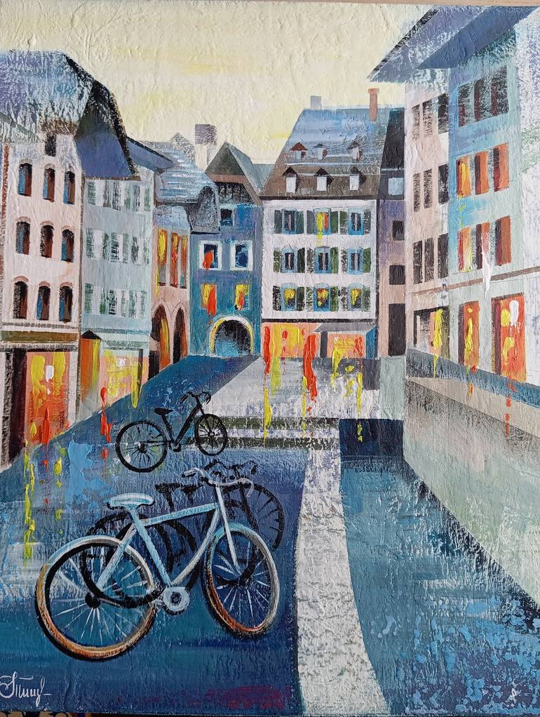 I painted this small picture in Switzerland. It depicts an old street in the city of Aarau. Evening has come and the windows of the houses are lit with warm light. The streets of the city are empty and only bicycles are waiting for their owners.