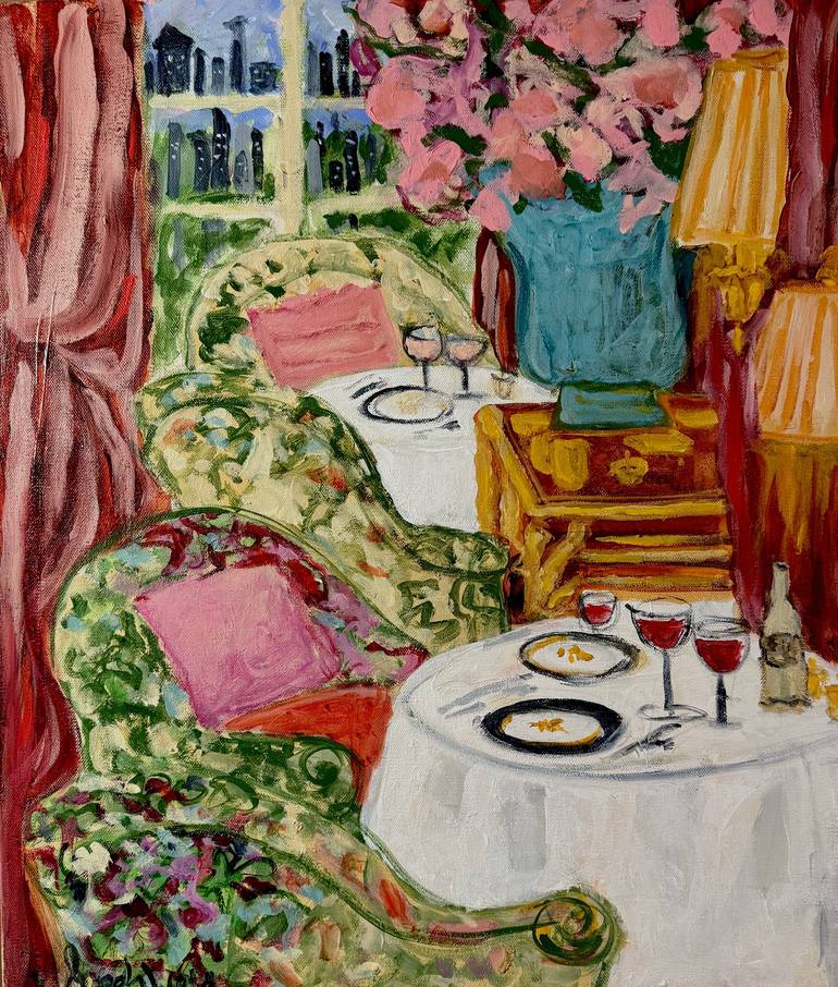 "I'll take Manhattan" like the song says... this painterly interior of a wonderful comfy restaurant right in the heart of Manhattan with the skyline of the city peeking through the window. Lots of warm color and mark makings...perfect for the lover of New York , New York!