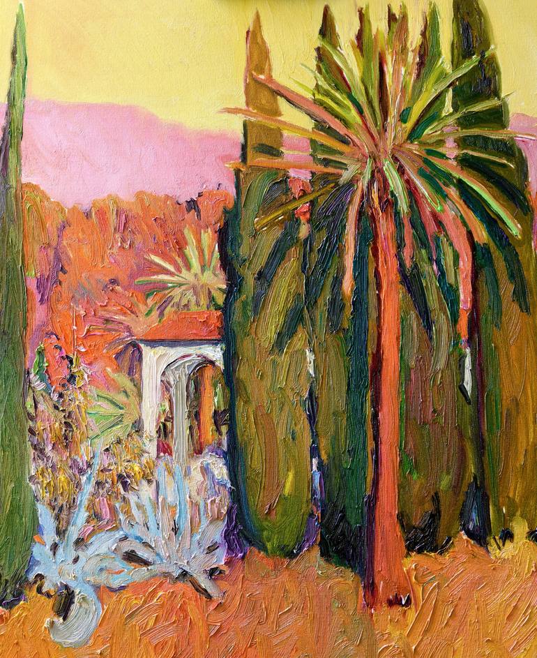 Bathed in the warm glow of a pink-orange sunset, this landscape painting captures the romantic ambiance of a Mediterranean park. The beautiful hues create a sense of warmth and tranquility, inviting you to escape into a world of vibrant colors. The artist's skillful use of impasto and thick, expres...