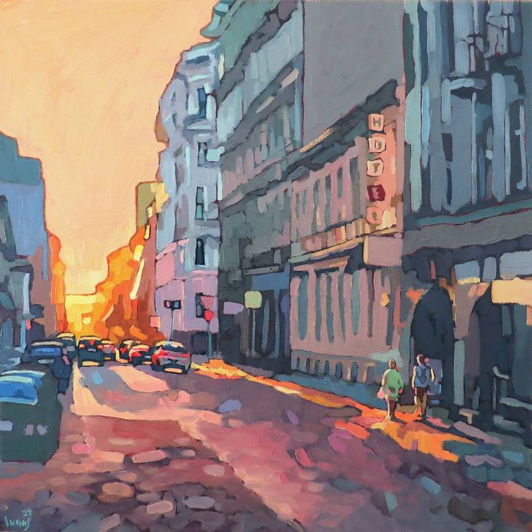 Summer pleinair painting, evening sunlight over the Riga historical center, Latvia. View of Dzirnavu street. Canvas stretched on wooden frame, the sides are completely painted, the painting is ready to hang. (No frame or stretching needed.)