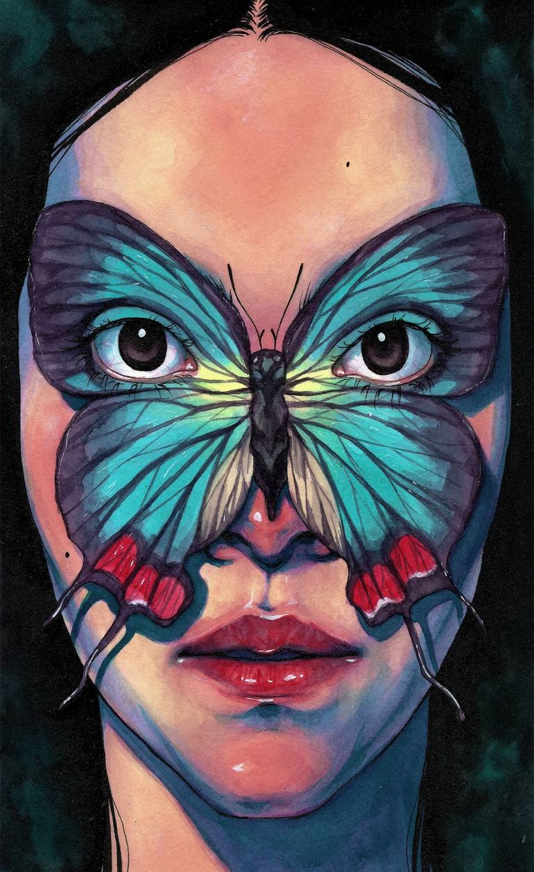 I made this painting based mainly on aesthetics. I love the different patterns butterflies can have on their wings, and some of them look like they have pupils on them, so I wanted to paint a butterfly on my face, my eyes blending with its wings, like we're just one being. The name of the painting i...