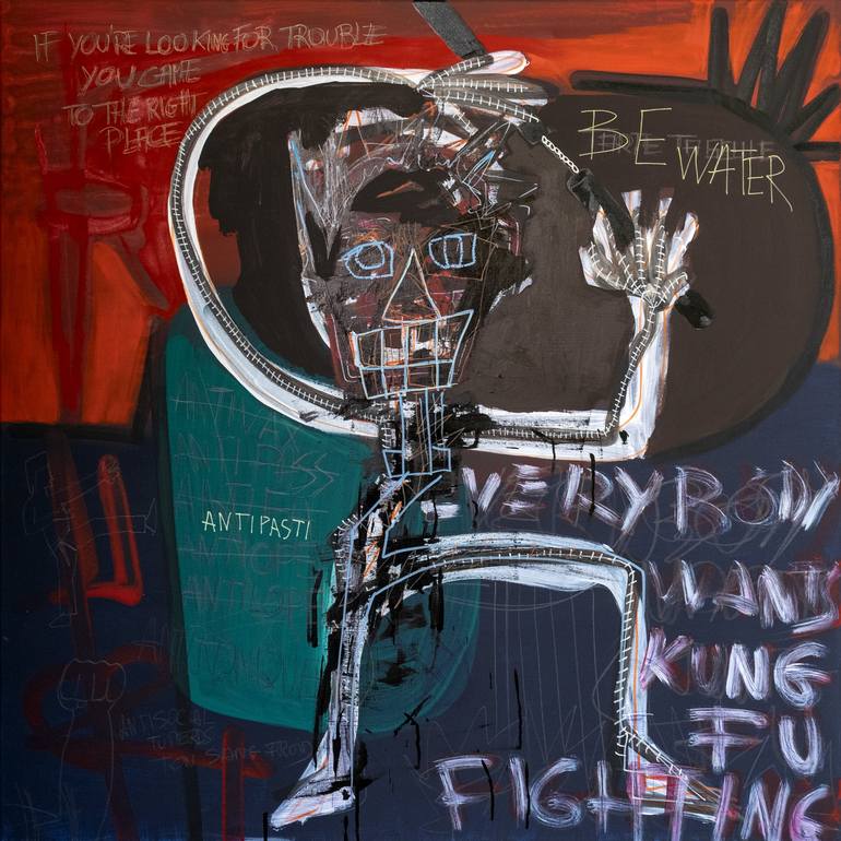This painting is inspired by a social phenomenon that makes me smile but also scares me. The anti-somethings who express themselves on social networks, in the street etc. like the antivax.