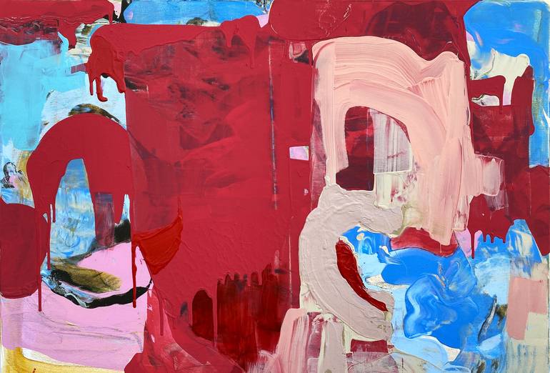 "Everything Could Happen" is an evocative abstract painting characterized by its vibrant, spontaneous, and expressive nature. The artwork employs a lively palette of summer colors, prominently featuring shades of coral, blue, and pink. These hues blend and contrast dynamically, invoking the warmth a...