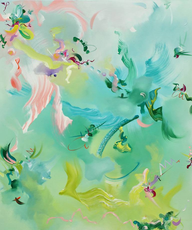 Actual size - 120 x 100 cm Contemporary abstract painting consisting of a green background layered with various gestural brush marks . Painted using high quality Old Holland oil paint My current work demonstrates my ongoing exploration of the medium of paint. Varying styles of paint application j...