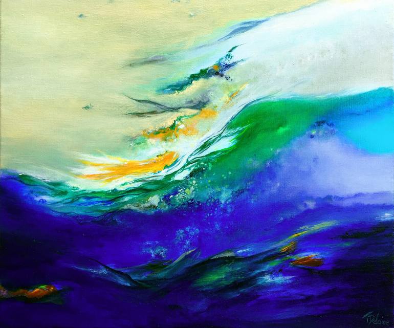 Abstract expressionist painting realized in April 2022, Evidence is a painting with blue, green and yellow cream dominants. The lower part looks like an underwater world. On the surface, an emerald green, white and orange wave washes up from right to left and in the center of the painting.