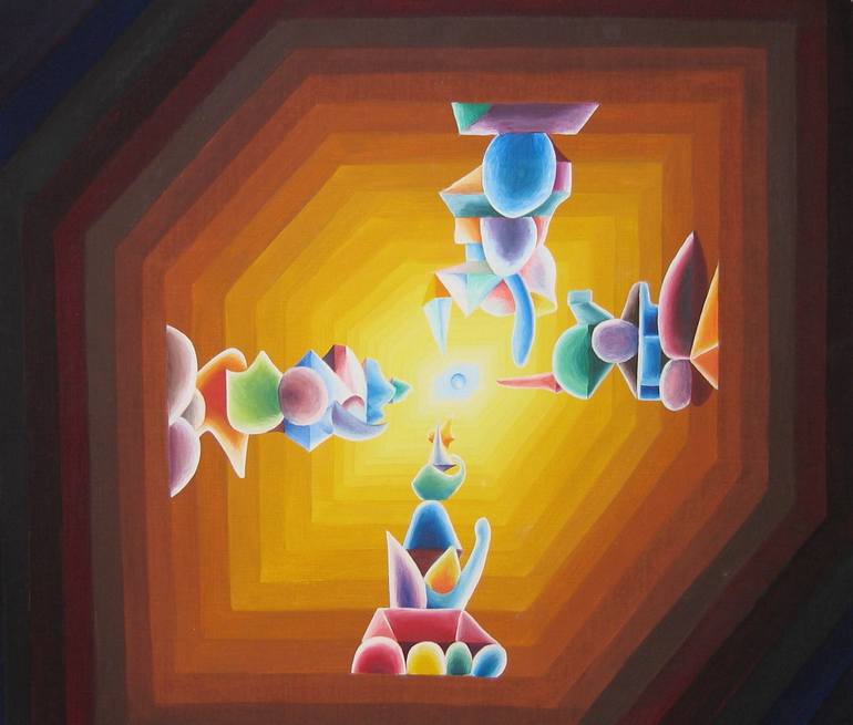 .....L'abstaction géométrique est, ici, un exercise concernant, en partie, l'illusion d'optique... ...L'expression d'un dégradé monochrome devait contraster avec qq figures colorées, en donnant l'illusion de la profondeur, vers un point à l'infini...
