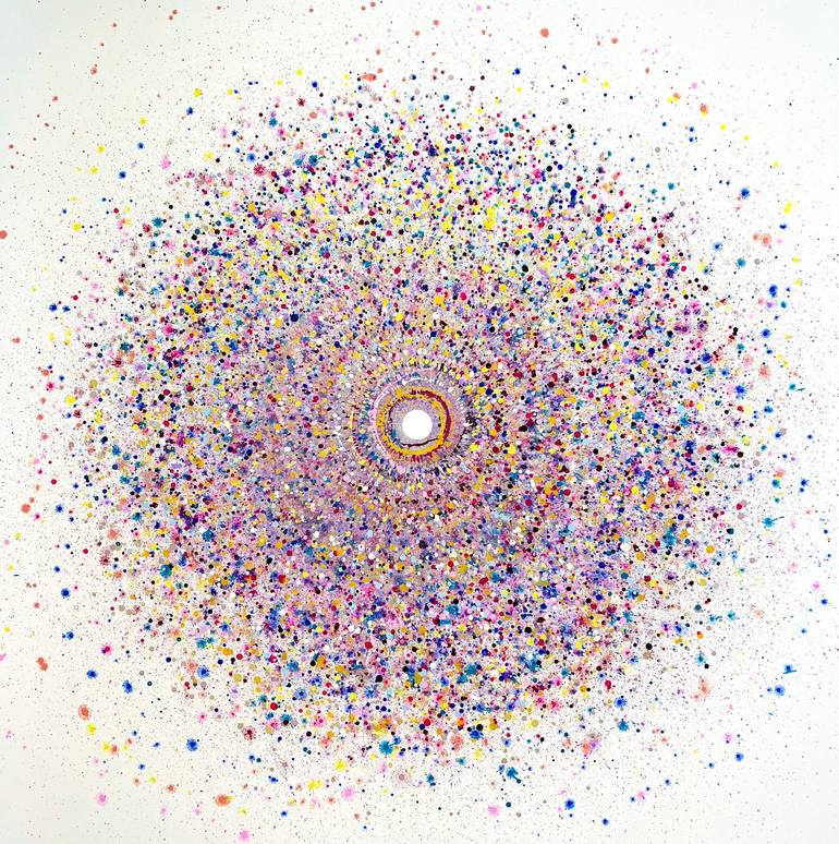 The artist was born in Nicosia, Cyprus (October 1987), where she currently lives and works. She holds a DNAP, (Diplôme National d’Arts Plastiques), from the Ecole Supérieure des Beaux-arts de Nîmes, as well as a DNAP and a DNSAP, (Diplôme National Supérieur d’Arts Plastiques), from the Ecole Nationale Supérieure des Beaux-arts de Paris, France, obtained with Distinction. Eleni Pratsi produces artworks with geometric compositions and explosive, liquescent colours. She utilises both painting and printmaking techniques, evoking a balance between creative control and affirmation of chance, which extends throughout all the works. Every composition is created from experimentation with different colour combinations and the infinite possibilities that surface through the repetition, overlap and juxtaposition of circles. The use of stencil, a meticulously cut-out original which meets the canvas, creates sometimes sealed, and other times porous boundaries for the vivid colours that are poured directly on it. The colour palette is influenced by pop culture, developments in pigments and industrial paint production, which Pratsi continually researches. The paint, whose density is specific but different every time, interacts within the in-between space of canvas and stencil in ways that are often surprising. The specifics of gravity, which carries the paint on the painterly surface, play an important part in the creation of colour drips and blocks. Having developed a special relationship to the materiality of painting and the multiplicity of printmaking, Pratsi proposes images that do not impose a fixed meaning but invite the eye to travel within otherworldly landscapes, seen as if from above. The visual and emotional connections one can make, lead to different interpretations of the works. The title of the exhibition, “La Vie en Ronde”, can be interpreted to refer to the “roundness” of life, that feeling of things being mysteriously tied to each other, turning on their own accord, flowing, mixing, and mingling on endless horizons. Evagoras Vanezis Art Theorist