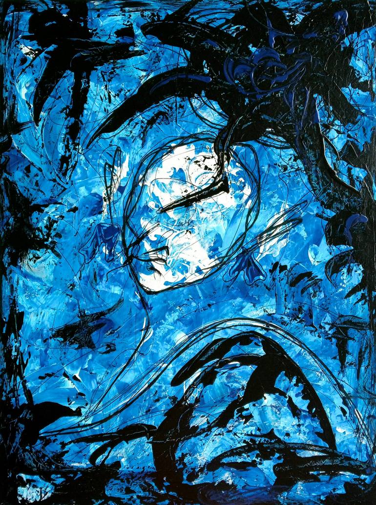 Original expressionism woman portrait painting. Discover the essence of woman abstract face painting with our close-up colorful abstract portrait! An unique, figurative and contemporary artwork that elevates any space. The deep blue color and splendid black enhances the uniqueness of this o...