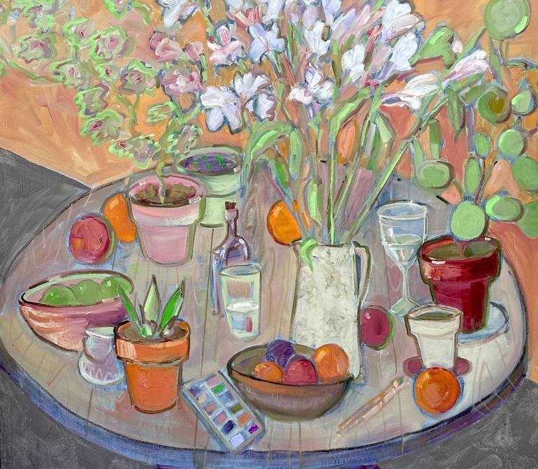 My garden table at my studio with items from the garden and flowers. Permanent green light is mixed into all of the colors and only makes an appearance as a pure color in a few spots.