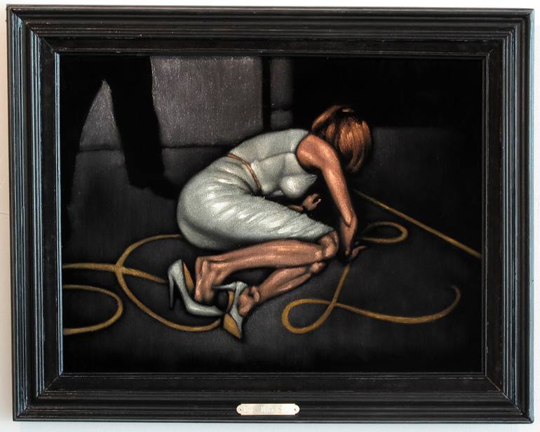 This work on velvet depicts a scene of celebrity humiliation caused by a paparazzi cameraman who struck actress Nicole Kidman on his bike, causing her to fall to the ground where she is subsequently photographed rather than helped to her feet. The moment captures an aspect of celebrity life that red...
