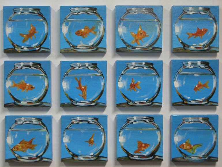 F.B .- FISH BOOK : E' UN POLITTICO FORMATO DA 12 MODULI DI 20X20 CM CIASCUNO, ASSEMBLABILI A GEOMETRIA VARIABILE. COME TANTI PESCIOLINI NEI BOCCIONI, ATTRAVERSO I SOCIAL MEDIA CI "VEDIAMO" RECIPROCAMENTE RESTANDO CIASCUNO NEL PROPRIO AMBIENTE VITALE