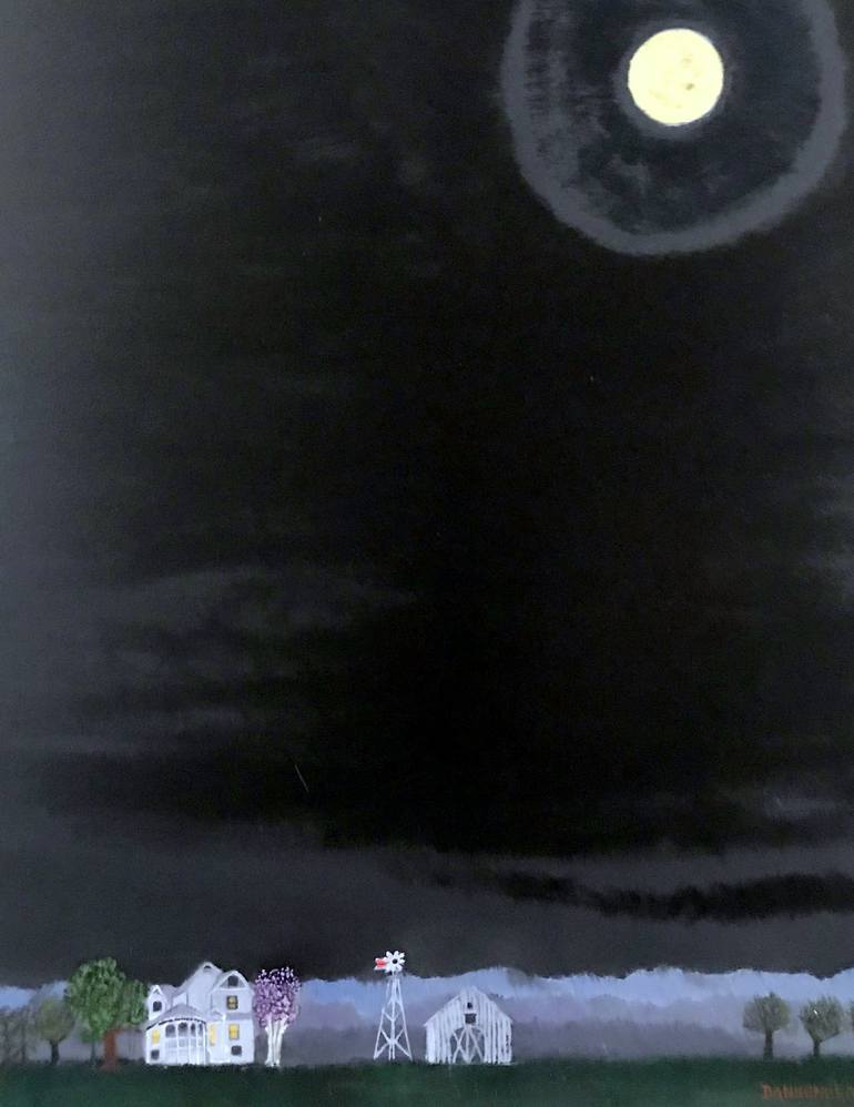 RURAL FARM HOUSE, WINDPUMP, BARN, AND TREES ILLUMINATED BY MOONLIGHT.